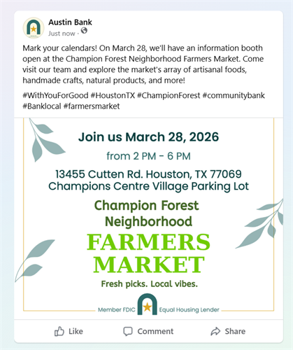 Join us this Saturday March 28, 2026, at the Champion Forest Neighborhood Farmers Market.