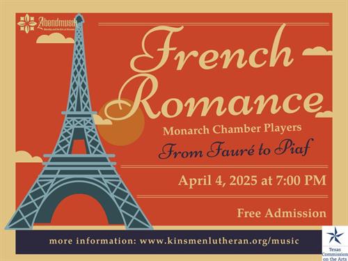 On April 4 at 7PM, we welcome the Monarch Chamber Players to a concert at Kinsmen. The concert will present a selection of French music for piano and strings. This program will include a medley of Edith Piaf songs, a quartet by Gabriel Fauré, and music by Houston composer Emma Wine. In between, the musicians will introduce the music and tell the audience about these selections. There will be a reception after the concert, too.