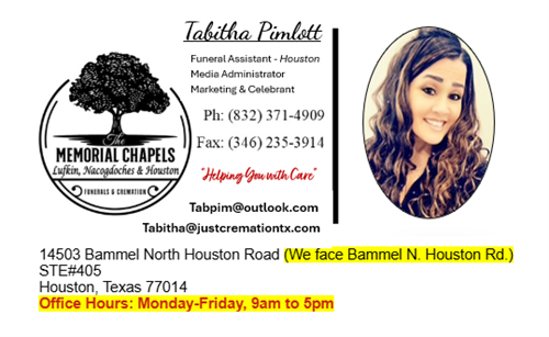 - Ms. Tabitha PimlottAdministrator/Funeral Assistant/Media/Marketing/Minister14503 Bammel North Houston Road Ste. 405Houston, TX 77014Phone: (832) 371-4909
